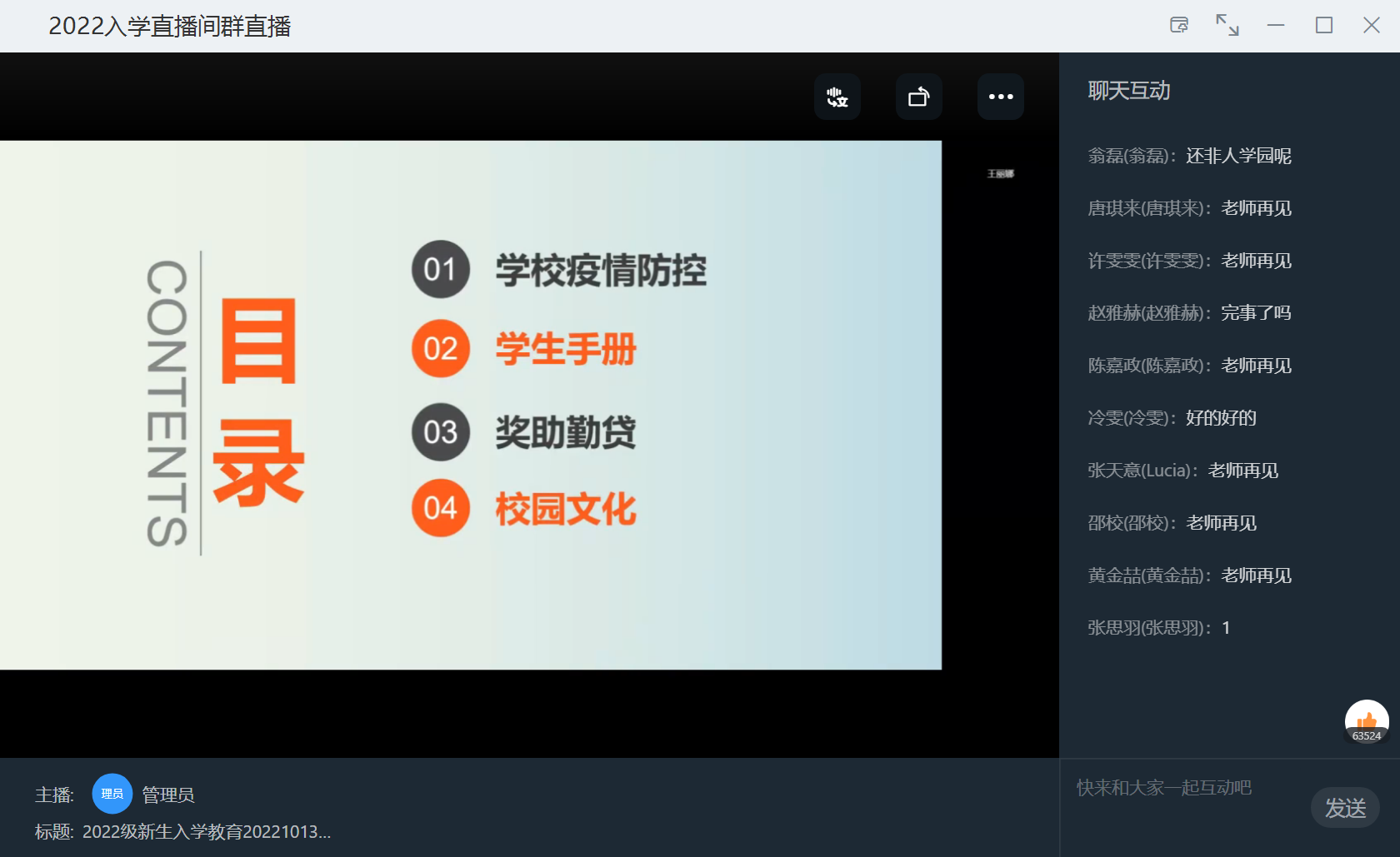 恰逢党的二十大召开前夕,2022级新生入学教育的主题为“喜迎二十大 学当新工匠”,由六个版块组成,分别为:普法教育、校友故事、安全教育、后勤服务保障宣讲、《学生手册》解读、《学籍管理规定》解读。分别由来自教务处、校友会、保卫处、总务处、学生处的六位讲师主讲。