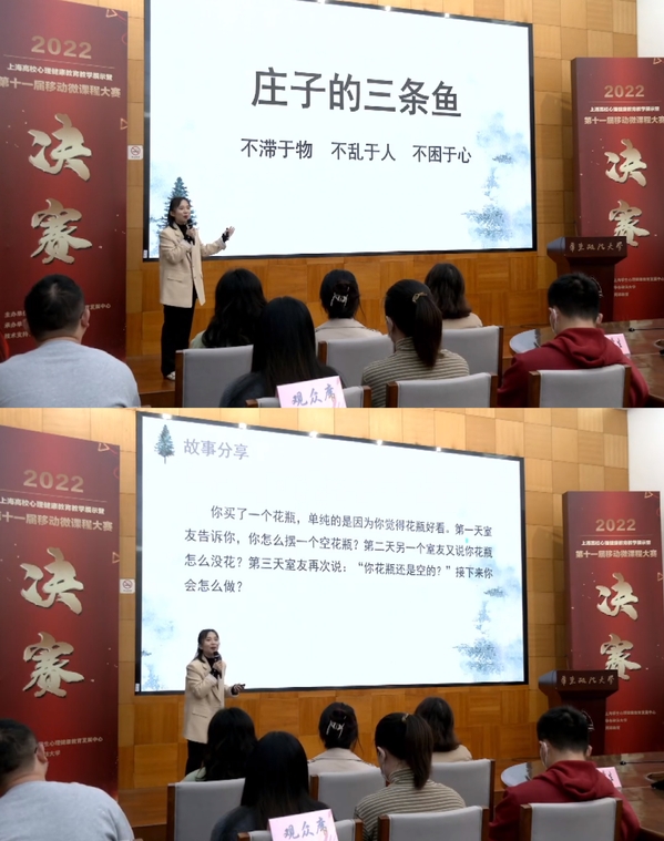 本次心理微课大赛,共收到22所高校的52件作品,经专家组评审,选出14位选手参加决赛及教学展示。我校作为此次入围决赛的唯一一所民办高职院校,与华东师范大学、华东理工大学、华东政法大学、上海师范大学等本科院校的专业选手同台竞技。韩文静老师以中国传统文化中“庄子的三条鱼”为主题,结合自己学生的案例,将近期热词“精神内耗”的成因、困扰和对策讲得深入浅出,生动有趣。课程设计既有心理育人的文化内涵又有思政育心的理论高度,得到评委们的认可。