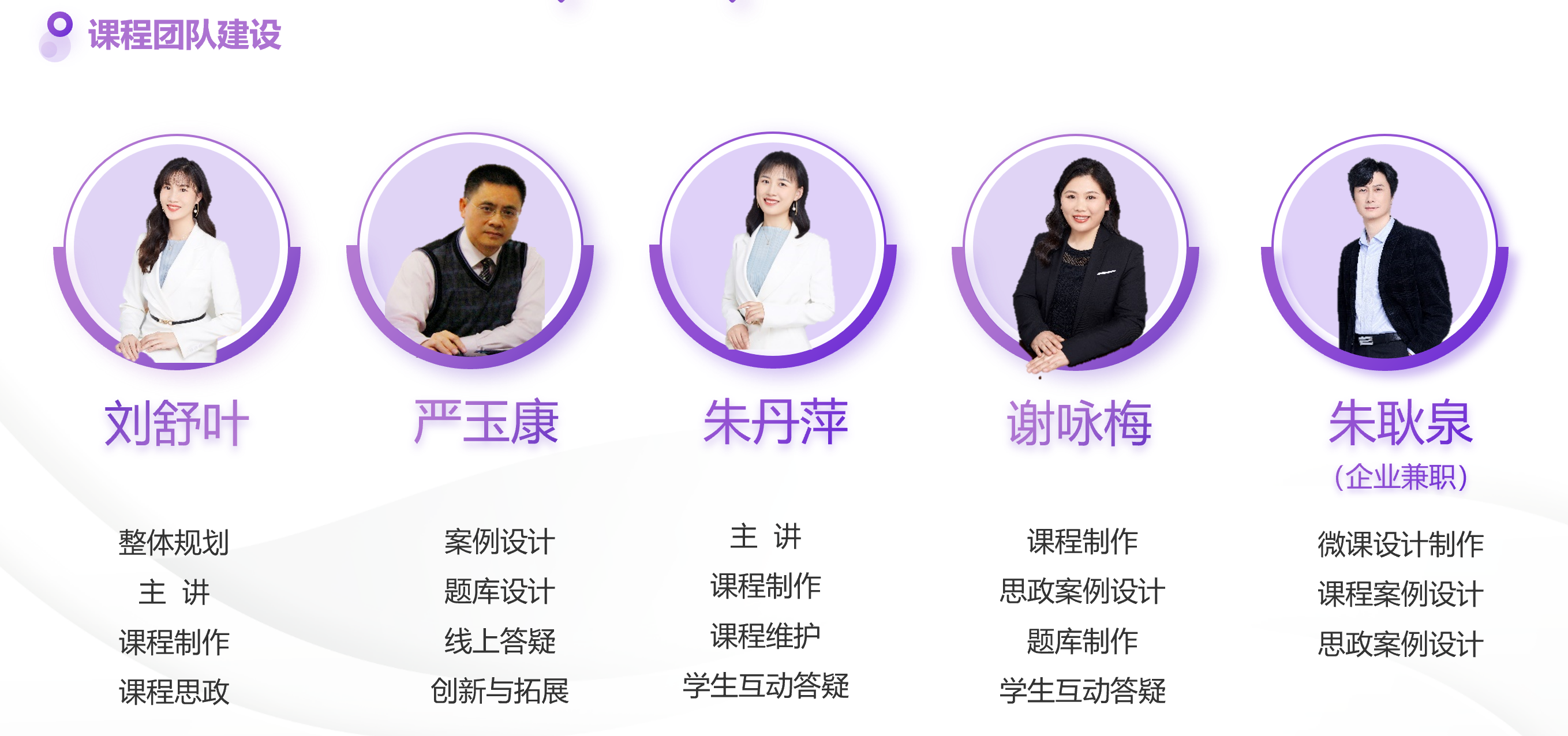 团队成员中,课程主持人刘舒叶副教授为全国职业院校技能竞赛智能财税赛项裁判员;严玉康教授为上海市高校教学名师、资深注册会计师、上市公司独立董事;朱丹萍老师和谢咏梅老师指导学生技能竞赛连续获得上海市团队第一、全国三等奖;谢咏梅老师曾获上海市育才奖;朱耿泉为校企合作单位上海添宁财务咨询有限公司(市级优秀服务机构)总经理,与团队成员共同参与课程建设,保障了课程教学中的专业性。