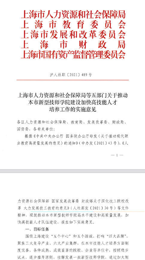 据上海市人力资源和社会保障局等五部门印发的沪人社职〔2021〕489 号文,大力推动新型技师学院建设,通过加大制度创新、政策供给、投入力度,探索构建政行企校多方协同的高技能人才培养机制,加快培养本市重点产业发展急需紧缺的高素质技术技能人才,有利于大力弘扬精益求精的工匠精神,营造尊重劳动、崇尚技能的社会氛围;有利于更好地服务上海三大先导产业、六大产业集群,推进经济社会可持续发展;有利于对接世界技术标准和技能要求,促进与世界先进水平接轨。