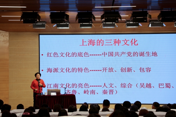 陈东教授应邀作《城市更新中的文化建设和文化人才培养》主题讲座。“一座城市有一座城市的品格。上海背靠长江水,面向太平洋,长期领中国开放风气之先”“开放、创新、包容已成为上海最鲜明的品格”。陈东引用习近平总书记对上海精神的解读,引发师生们对上海城市精神的思考。她指出,文化是城市的灵魂和名片,是城市产业经济的助推器,是社会和谐的润滑剂。城市建设和更新的关键是软硬件的匹配,做到“百业为壳,文化是核”,“重商不能轻文,经商必须守信”,“庙堂有规矩,江湖有道义”。她强调,上海具有红色文化的底色、海派文化的特色和江南文化的亮色。陈东娓娓道来,通过纸质媒体、广播、话剧、舞剧、电影、戏剧、音乐等多种形式的文化载体的介绍,上海作为文化码头和源头的重要意义与海派文化的博大精深跃然而出。讲座现场,陈东风趣的运用一连串问话与听众进行互动,列举一个个事实让师生走进文艺世界,了解幕后故事。陈东还时而穿插栩栩如生、声情并茂地演绎,将讲座现场变成了名家舞台,令在座师生如身临大剧院一般,精彩讲座和艺术享受博得师生们的阵阵热烈掌声。
