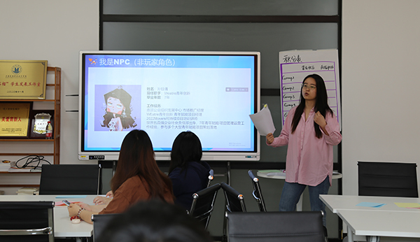 培训邀请了Movers可持续培训讲师孙钰倩、丁玲担任主讲,两位老师具有多年青年赋能与职业发展项目经验。培训课上老师首先模拟一个求职人物,让学生们随机分组建立“智囊团”,以团队合作的形式帮助预设人物从职场“小白”晋级成为职场“精英”。使学生们在帮助预设人物求职的过程中,能够自主思考,结合自身的兴趣爱好和优劣势为自己制定未来方向,提高自身的求职能力。整个培训过程中,参训学生们与主讲老师积极互动,实时配合,课堂氛围活跃高涨。