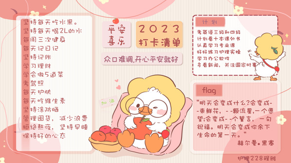 为引导学生“走出宿舍、走出网络、走向阳光、走向健康、走向未来”。3月起,学生工作部开展“追光”行动,号召同学们“一起来做追光者”,共分两项主题活动。其中晒一晒“我的2023打卡清单”活动,鼓励学生制订计划、追逐梦想;踔厉奋发、奔向未来。以良好的精神面貌,推进优良学风建设,迎接校庆三十周年。学生工作部共收到学院推荐作品82份,经过评选18位学生获得“打卡达人”称号作品展示如下(注:按姓名首字母排序)。