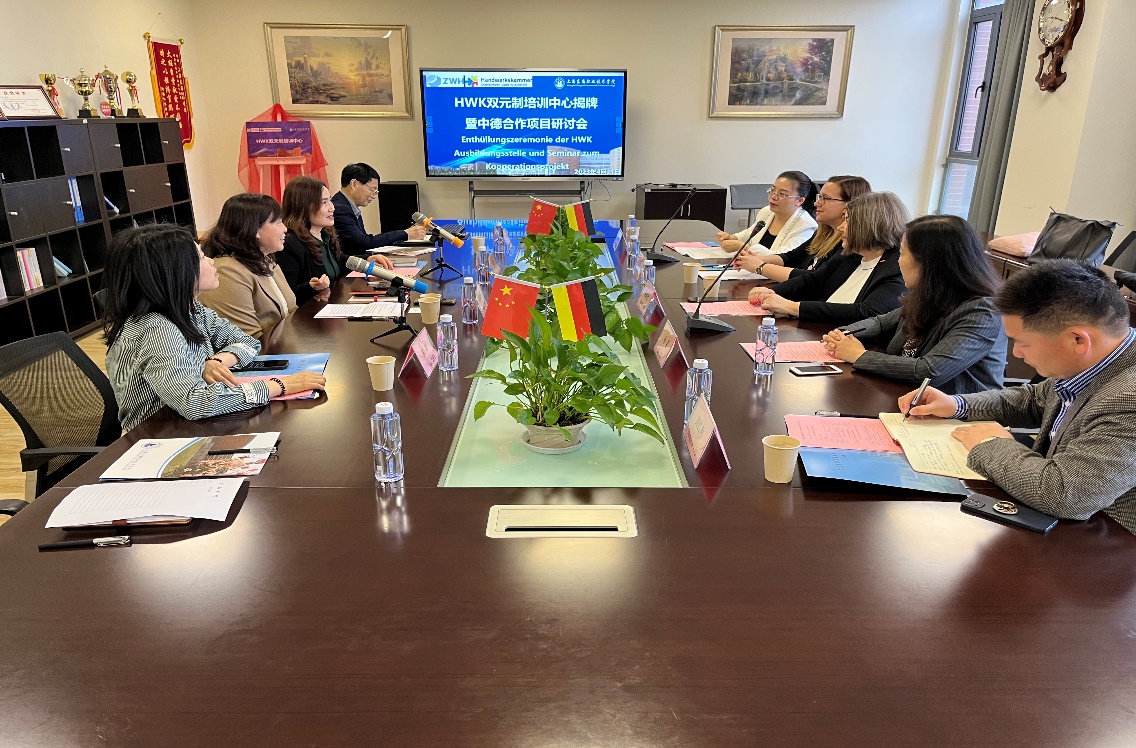 副校长卓丽环在揭牌仪式上致辞,并与东威斯特法伦协会总经理伊利戈揭牌。随后,东威斯特法伦协会总经理伊利戈、手工业培训总部国际处副部长毛丹姿、机电学院院长杨萍等分别发言,双方就数字化时代下职业教育的转型发展问题进行深入研讨。会后,校长王刚会晤德国职教专家并交流,对“HWK双元制培训中心”落地东海学院表示感谢,希望双方加强合作,共同推动项目健康发展,培养更多的国际化技术技能人才。