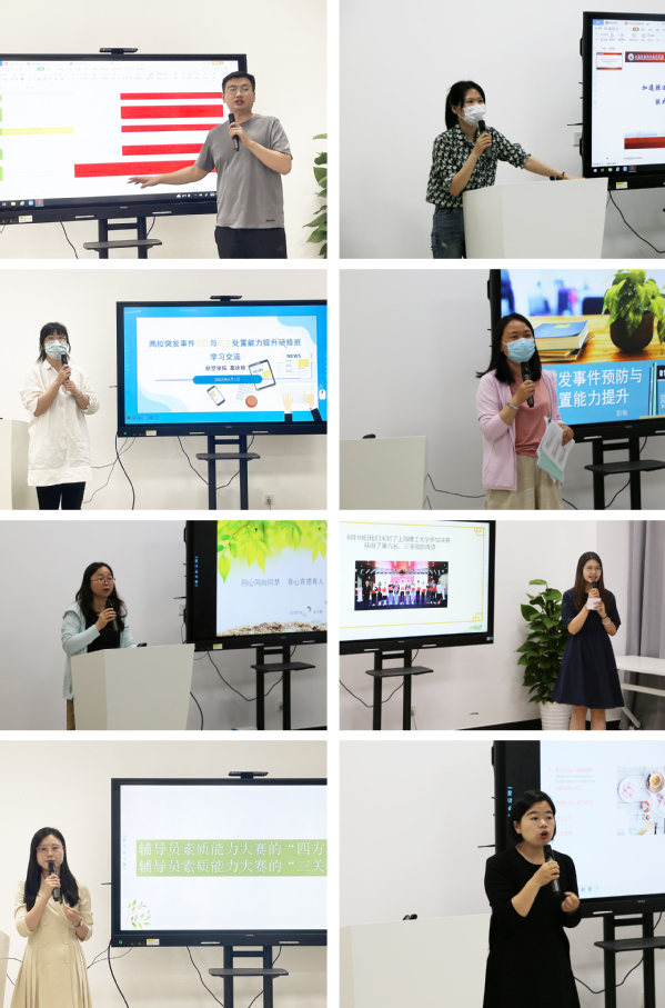 辅导员学习交流分享环节中,教育学院马祥龙、机电学院沈艳分享了参加“加速推进高校一站式学生社区综合管理模式改革专题研修班”的相关经验,通过借鉴成熟高校一站式工作的经验,结合我校一站式试点宿舍楼推进情况,对目前成果和下一步推进计划进行了梳理;航空学院葛徐艳、护理学院彭艳传达了“高校突发事件预防与应急处置能力提升研修班”的培训内容和精神,结合我校具体学生工作案例,对校园学生安全隐患的主要类型和危机干预情况进行了分享交流;经管学院许小梅以“同心同向同梦,育心育德育人”为主题,分享了自己参加全国高职院校学生工作高质量发展研修班暨“三全育人”工作专题研讨会的心得体会。各位支部书记的分享由点到面、由浅入深,与辅导员日常工作结合紧密,理论联系实际,提出自己的工作思考,让与会辅导员们学习了经验,得到了启发。