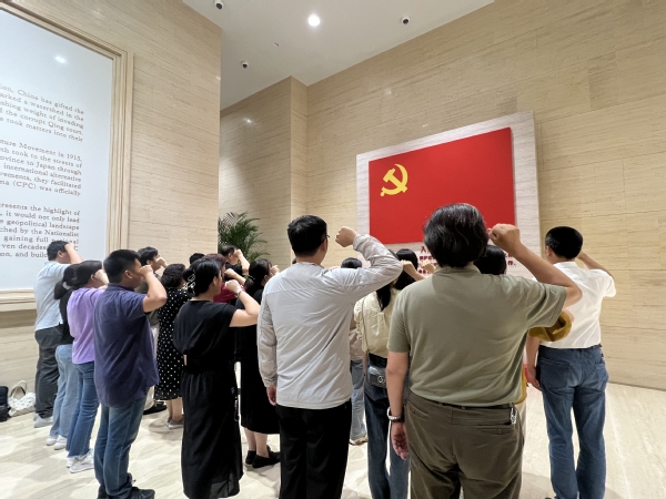 中共一大纪念馆综合采用文物实物、视频、油画雕塑、实景还原、多媒体声像等多种展示手段,生动系统地向前来参观的人们讲述着中国共产党由一个不到60人的党,发展壮大成拥有9600多万名党员的世界最大执政党,带领全中国人民救国、兴国、强国,为中国人民谋幸福,为中华民族谋复兴的伟大历史。在纪念馆内,从“前赴后继、救亡图存”“民众觉醒、主义抉择”,到“早期组织、星火初燃”“开天辟地、日出东方”“砥砺前行、光辉历程”,王刚、曹蓉蓉一行沿着主题展区,在讲解员带领下,认真听、仔细看,并不时用手机拍下影像。在各主题展区,各类展品描绘了近代以来中华民族在中国共产党领导下走上光明道路的历史图景,史诗般重现了中国共产党的创建历程,无数仁人志士、革命先烈矢志不渝奋斗砥砺中华民族伟大复兴的奋进征程。大家还不时停下脚步,认真观看珍贵视频,驻足凝视档案史料,回首党的光辉历程,领会伟大建党精神。在鲜艳的党旗下,全体党员举起右手,紧握拳头,重温入党誓词。