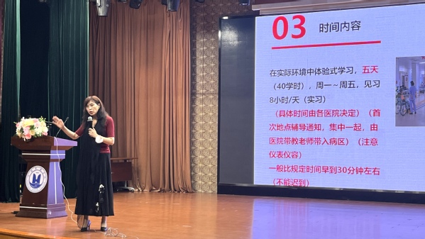 会上,院长张美琴就见习期间的安全意识、规则意识等方面展开讲解,向学生们强调要严格遵守校规和医院的各项规章制度,参加所在科室的各项活动,接受科室管理,尊敬老师,服从老师们的安排。