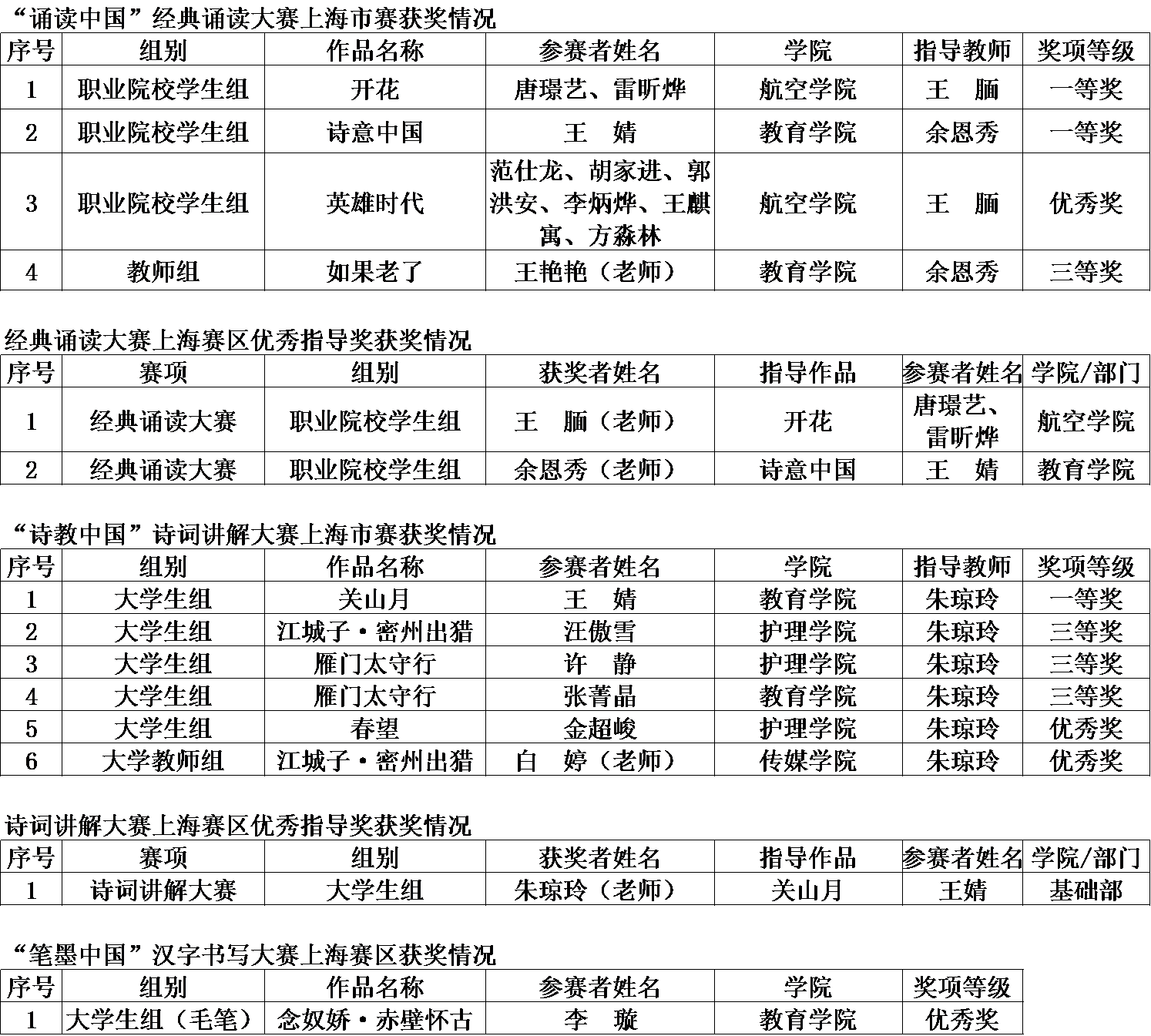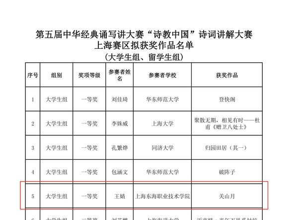 近日,上海市语言文字工作委员会公布了第五届中华经典诵写讲大赛(上海赛区)获奖名单,我校师生共获14个奖项(详见下表),其中,4件作品在“诵读中国”经典诵读大赛(简称“诵读大赛”)中获奖,6件作品在“诗教中国”诗词讲解大赛(简称“讲解大赛”)中获奖,1件作品在“笔墨中国”汉字书写大赛中获奖,3位指导教师获“优秀指导奖”。