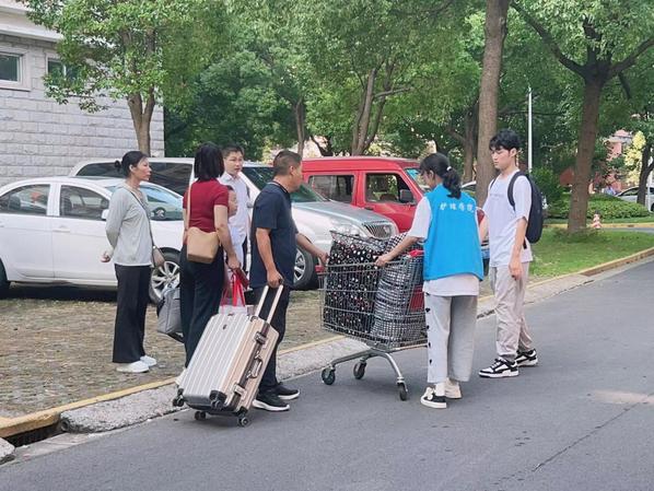 学生和家长在到达学校后,就迎来了热情接待他们的老师与迎新志愿者,亲切的问候,热情的服务,便捷的帮助,一个个身穿蓝色马甲的志愿者忙着穿梭在服务新生招待中,他们挥汗如雨,忙的热火朝天,招呼新生喊哑了嗓子,不顾行李重磨疼了手,健步如飞拿着新生的行李,带着他们办理好入学手续,引领到宿舍放置行李物品,带着同学熟悉食堂、教学楼和体育馆等场地,用实际行动迎接学弟学妹们,化身引领者为新生领航。