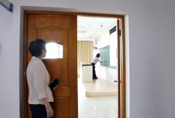 2023年9月25日是学校2023级新生开学第一天。早晨,预备铃声刚刚敲响,校长王刚、党委书记曹蓉蓉等全体校领导及相关职能部门责任人,一同巡视了东海源、匠兴苑、德艺馆的多媒体教室、语音室、实训室、机房等教学场所,对教师授课、学生出勤、课堂纪律、教学环境等进行巡视。