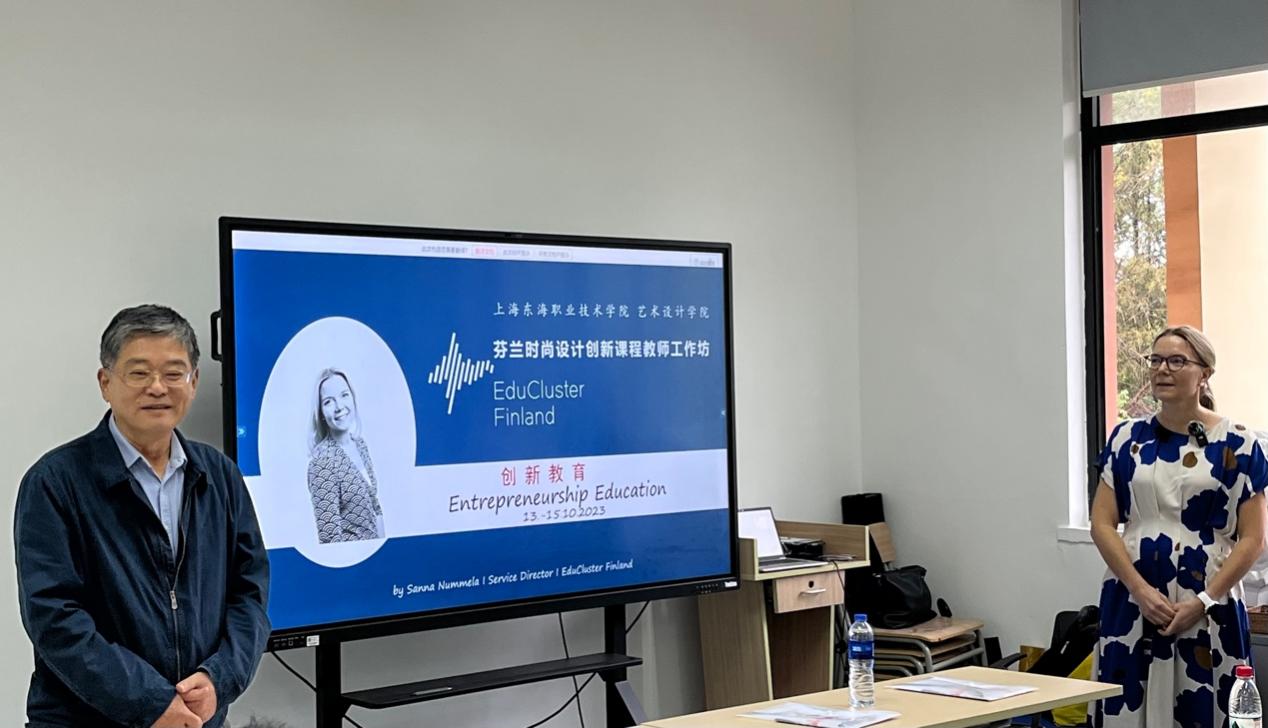 作为市级高水平专业群建设的重要内容之一的、时尚设计专业群海外合作项目——芬兰时尚设计创新课程教师工作坊于2023年10月13日至15日在上海东海职业技术学院艺术设计学院举办。芬兰教育集群培训专家Sanna Nummela和中方老师曹煜担任此次创新课程工作坊的专职教学老师,来自上海东海职业技术学院、贯通对口的上海市现代流通学校、上海市第二轻工业学校、上海市经济管理学校的37位教师学员参加此次为期三天的培训课程。上海东海职业技术学院王刚校长在开课仪式上致辞,艺术设计学院顾惠忠院长主持开课仪式。