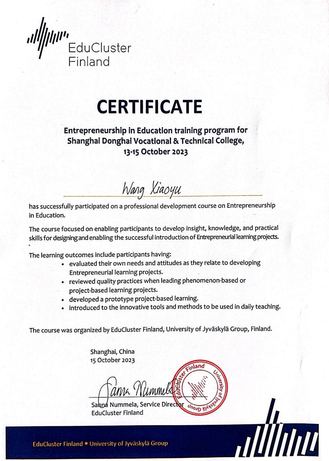 参加本次创新课程教师工作坊的学员们互动和反馈热烈积极,通过最终评估考核的学员获得了芬兰教育集群颁发的芬兰创新课程证书。