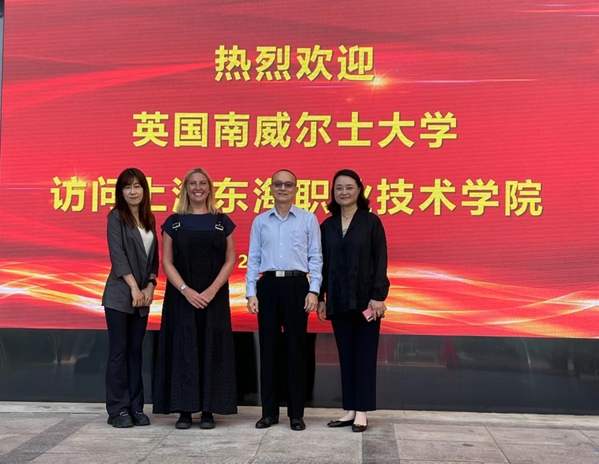 2023年10月24日,英国南威尔士大学国际事务主管Kim Williams、校友和招生官员Ella Tang在上海震东商务进修学院副院长朱正琪陪同下访问我校,校长王刚、副校长卓丽环会见了英国朋友。国际交流办公室主任孟昭上参加会见。