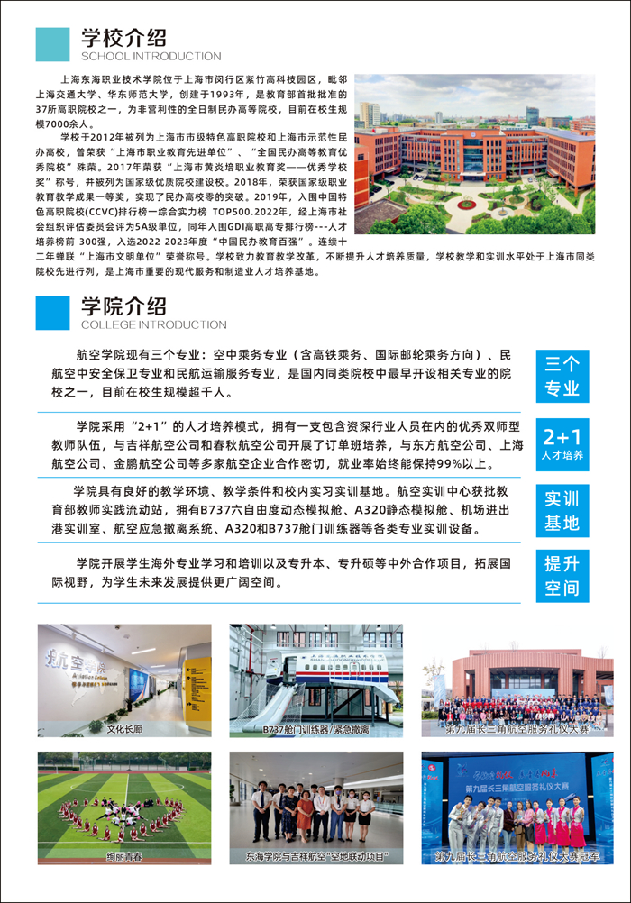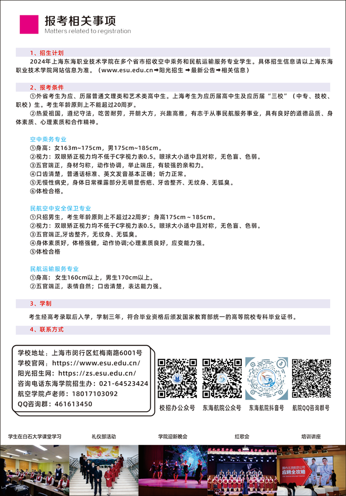 2024年,上海东海职业技术学院在各省招收空中乘务、民航空中安全保卫专业考生面试工作即将开始,考生需参加面试合格获得报考资格,并参加2024年秋季全国统一高考,按高考文化课成绩从高到低择优录取。