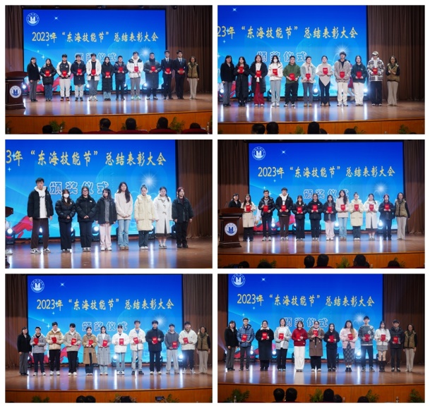 随后,校党委书记曹蓉蓉宣读学校表彰决定。2023年我校共设置技能大赛相关荣誉称号四种,获得荣誉称号师生共计273人(教师36人、学生237人),其中“东海金牌指导”2人、“东海优秀指导”34人、“东海技能之星”158人、“东海专业技术能手”79人。校领导王刚、曹蓉蓉、贺瑛、郁萍、卓丽环分别为各位获得荣誉称号的师生代表颁发荣誉证书以及奖杯、奖牌。“东海优秀指导”胡骁杰老师和“东海技能之星”王士鹏同学分别发表获奖感言。