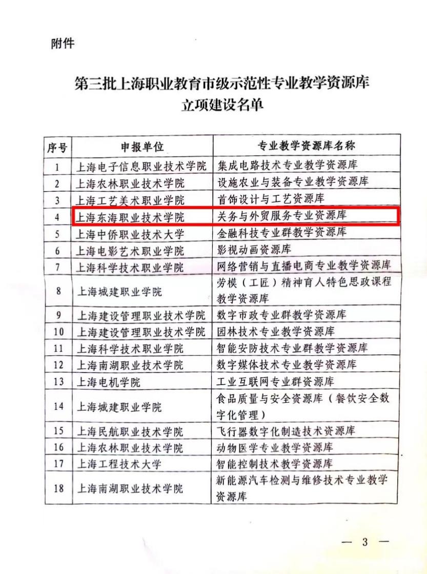 近日,上海市教育委员会印发了关于公布第三批上海职业教育市级示范性专业教学资源库立项建设名单的通知。在全市拟立项的18个市级职业教育专业资源库中,我校经管学院关务与外贸服务专业教学资源库名列其中,获市级立项。