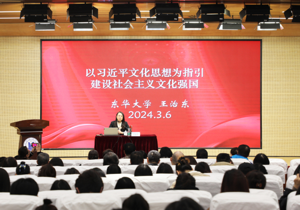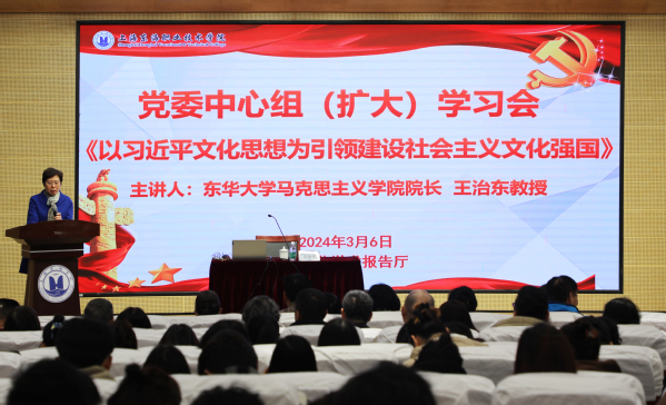 3月6日上午,学校在匠兴苑学术报告厅召开了党委理论中心组(扩大)学习会,东华大学马克思主义学院院长王治东教授应邀作《习近平文化思想》专题辅导报告。党委书记曹蓉蓉主持会议。