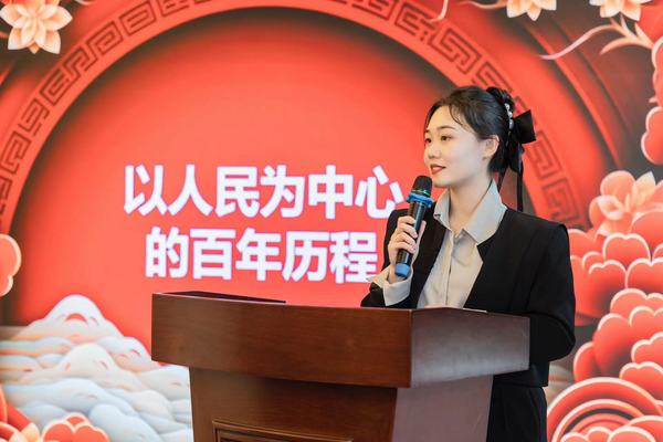 “党依靠人民,从小到大、从弱到强,打败了强大的内外敌人,取得了新民主主义革命胜利,实现了民族独立、人民解放,建立了中华人民共和国。”随后,马克思主义学院青年教师梁艺馨以《以人民为中心》为主题,带领同学们走进新民主主义革命时期、社会主义革命和建设时期、改革开放和社会主义现代化建设新时期、中国特色社会主义新时代,感悟党始终坚持以人民为中心,坚持人民至上的初心使命。她充满热情的讲述深深地打动着在座的师生。