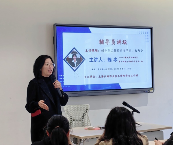 为有效提高辅导员队伍的稳定性,提升辅导员的育人本领,4月9日,学生工作部特邀2023年最美高校辅导员,第十四届全国辅导员年度人物,2020年上海辅导员年度人物,东华大学从事辅导员一线工作数十年的魏冰副教授来到匠兴苑305传经送宝。她带来的主题是《辅导员工作的变与不变,大与小》,全体辅导员老师参加,讲座由学生工作部部长岳宝华主持。