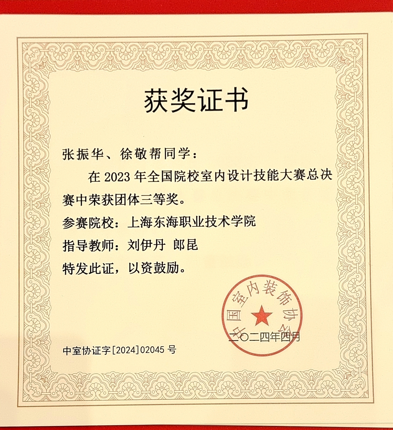 在2023年全国院校室内设计技能大赛中,艺术设计学院学生环艺211班张振华、室内211班徐敬帮由学院环境艺术设计专业教师刘伊丹、郎昆带领取得了2023年全国院校室内设计技能大赛总决赛团体三等奖的好成绩,为学校和学院争得了荣誉。