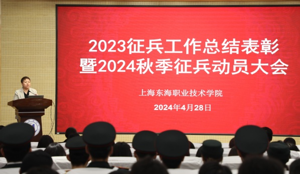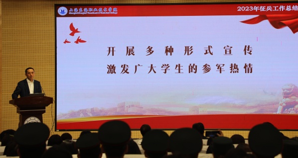 首先,武装部蒋久泉对2023年征兵工作做了总结:在校党委和征兵工作领导小组的领导下,各学院、部门紧密协作,高标准完成了征兵工作任务。2023年上级分配我校任务数为57人,我校实际完成58人,男生应届毕业生入伍比例超过90%。学校武装部被闵行区人武部评为“2023年征兵工作先进单位”,市教委来校进行征兵工作督查、调研时,对我校的征兵工作给予充分肯定。