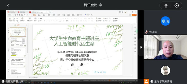 为了不断增强我校师生的生命意识,引导师生深入思考生命的意义,提升人文情怀与心理健康,培养全面发展的时代新人,由校党委学工部心理咨询中心主办,经管学院承办的“人工智能时代话生命”大学生生命教育主题讲座,于5月10日晚上在线上平台进行。本次讲座特邀华东师范大学青少年心理健康教育研究与培训中心主任、心理与认知科学学院张麒副教授主讲,讲座由经管学院兼职心理辅导员宋青青老师主持。此次讲座旨在引导大学生在快速发展的科技背景下,深入思考生命的意义与价值,探索如何在人工智能时代保持人的本质与尊严。