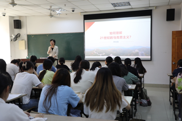课堂上,曹蓉蓉在对“马克思主义的科学内涵”“马克思主义的主要内容”“马克思主义的独特魅力”分析与解读的基础上,结合马克思主义中国化的发展历程,加深同学们对习近平新时代中国特色社会主义思想的理解与认知。中国共产党在领导中国革命、建设、改革的长期实践中,坚持把马克思主义基本原理同中国具体实际相结合,不断推进马克思主义中国化,先后创立了毛泽东思想、邓小平理论、“三个代表”重要思想、科学发展观等重大理论创新成果,指引中国人民夺取一个又一个伟大胜利。党的十八大以来,以习近平同志为主要代表的中国共产党人,顺应时代发展,从理论和实践结合上系统回答了新时代坚持和发展什么样的中国特色社会主义、怎样坚持和发展中国特色社会主义这个重大时代课题,创立了习近平新时代中国特色社会主义思想。这一思想,是对马克思列宁主义、毛泽东思想、邓小平理论、“三个代表”重要思想、科学发展观的继承和发展,是马克思主义中国化最新成果,是当今时代最现实、最鲜活的马克思主义。
