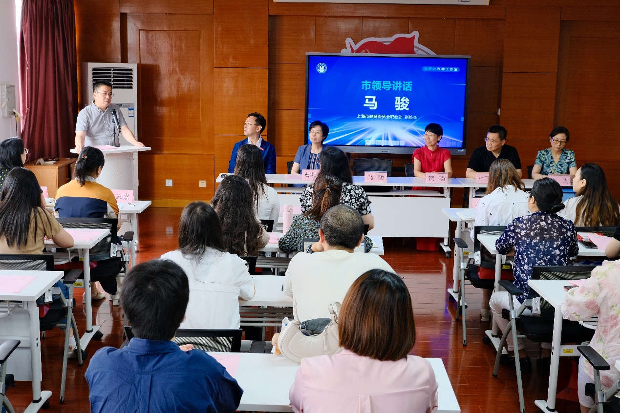 上海市教委职教处副处长马骏莅临指导,我校校长贺瑛,党委书记曹蓉蓉,副校长严玉康,校长助理兼教务处处长张居阳,人事处处长许岚,名师工作室主持人刘舒叶,以及工作室全体学员出席了揭牌仪式,工作室还邀请了本市各兄弟院校相关领导和老师参加本次活动。揭牌仪式由张居阳主持。
