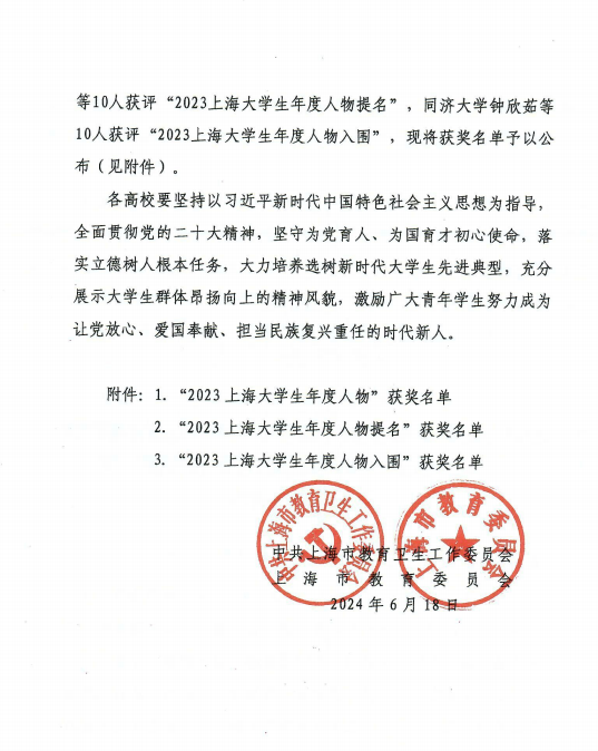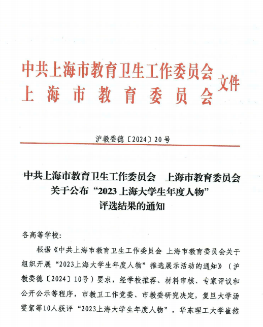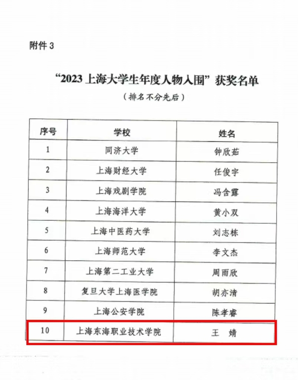 日前,上海市教委发布了《关于公布“2023上海大学生年度人物”评选结果的通知》(沪教委德〔2024〕20号),我校教育学院学生王婧榜上有名,喜获“2023上海大学生年度人物入围”奖,她是民办高职院校唯一入围的学生。