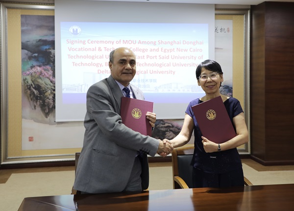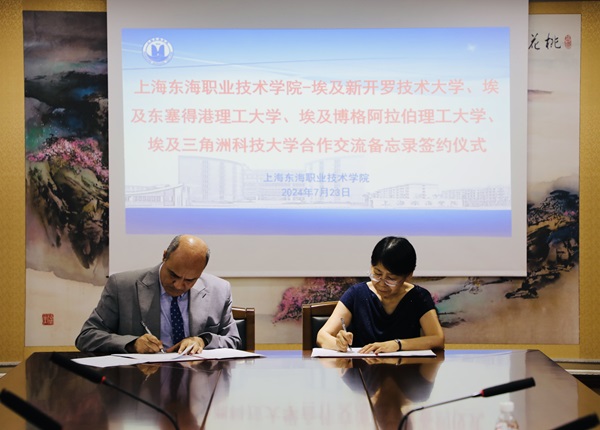 随后,塔立克·阿卜杜勒马拉克校长代表埃及新开罗技术大学、埃及东塞得港理工大学、埃及博格阿拉伯理工大学、埃及三角洲科技大学与上海东海职业技术学院校长贺瑛签署了五校校际合作交流备忘录。