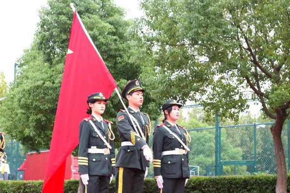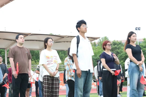 在《义勇军进行曲》的激昂旋律中,五星红旗冉冉升起,师生们行注目礼,表达对祖国的无限热爱与深切祝福。