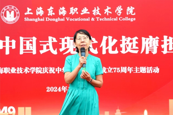 在国旗下,校长贺瑛发表了讲话。她回顾了新中国成立75年来的辉煌历程,在中国共产党的正确引领下,全国各族人民团结一心、共同奋斗,使祖国实现了从站起来、富起来到强起来,书写了人类发展史上惊天动地的壮丽篇章。我们共同见证了经济建设的飞速发展,科技创新的日新月异,社会生活的全面进步,国际地位的显著提升。贺瑛勉励东海学子要珍惜青春、不负韶华,将个人理想融入国家发展大局,以实际行动为中国式现代化贡献力量。