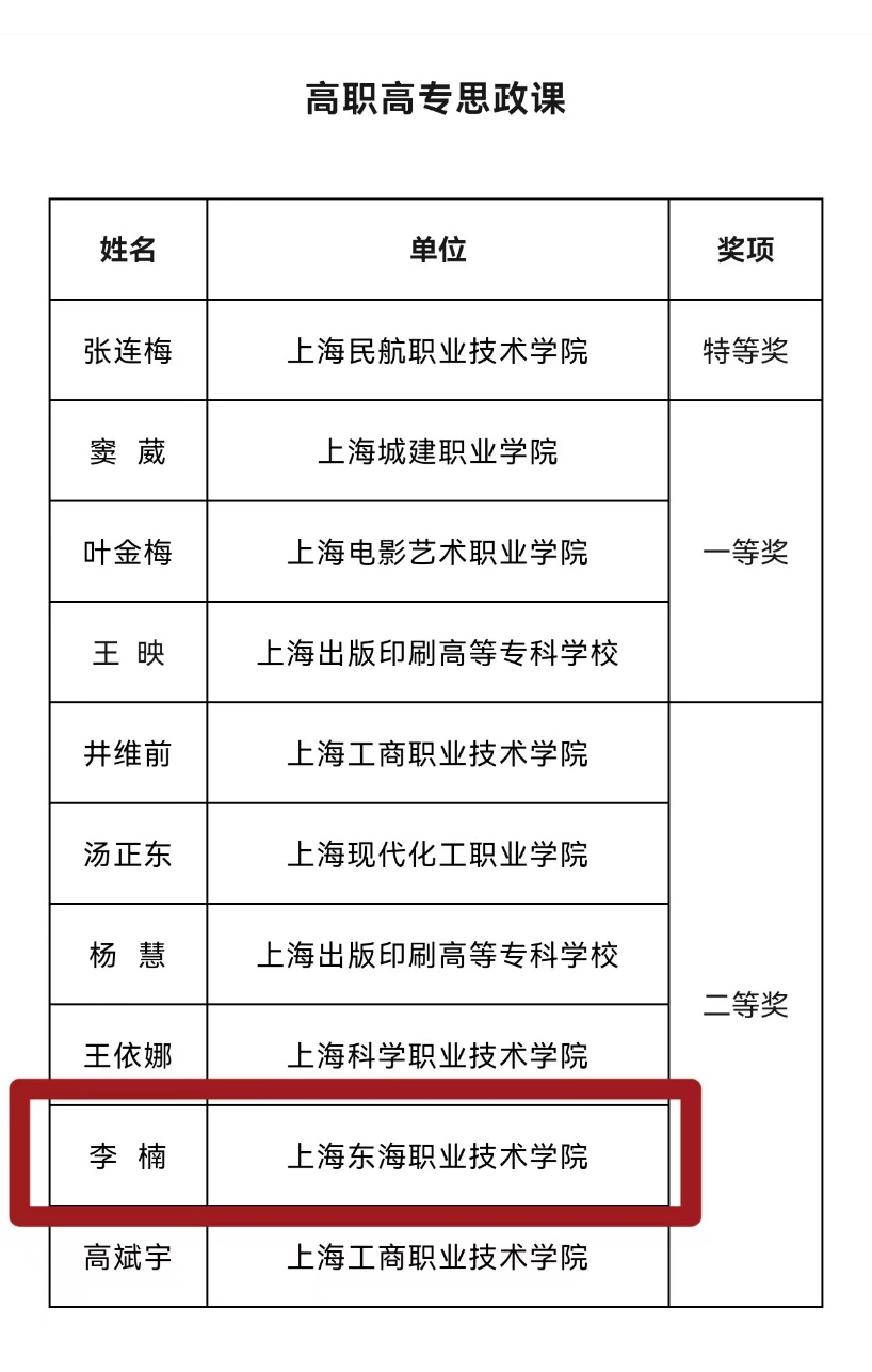 日前,“讲台上的新思想”——2024年上海高校思政课教师教学大比武暨教学展示活动获奖名单公示,东海学院马克思主义学院3位教师在2024年上海高校思政课教师教学大比武暨教学展示活动中获奖,其中李楠老师荣获“高职高专思政课”组二等奖;李楠、梁艺馨、秦媛3位老师的教案成功入选精彩讲义。