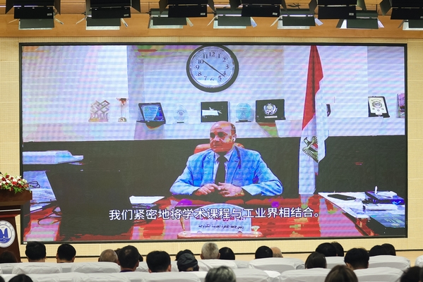 塔雷克·阿卜杜勒·马拉克通过视频向与会来宾介绍了埃及新开罗科技大学产教融合办学概况,他指出,学校特别关注学生是否具备了进入就业市场所需的能力,致力于培养出既符合学术要求又满足行业需求的高素质人才。