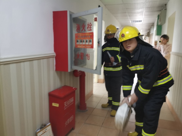 随着演练指令的下达,模拟火灾现场瞬间烟雾弥漫。两名保安巡逻人员迅速拿起灭火器,对初起火灾进行了有效的扑救,为后续的疏散工作赢得了宝贵的时间。与此同时,微型消防站的队员也迅速响应,他们熟练地连接水带,对火势进行了进一步的控制和扑救,以最快的速度对火源进行了有效控制,充分展现出了我校高效的应急处置能力。