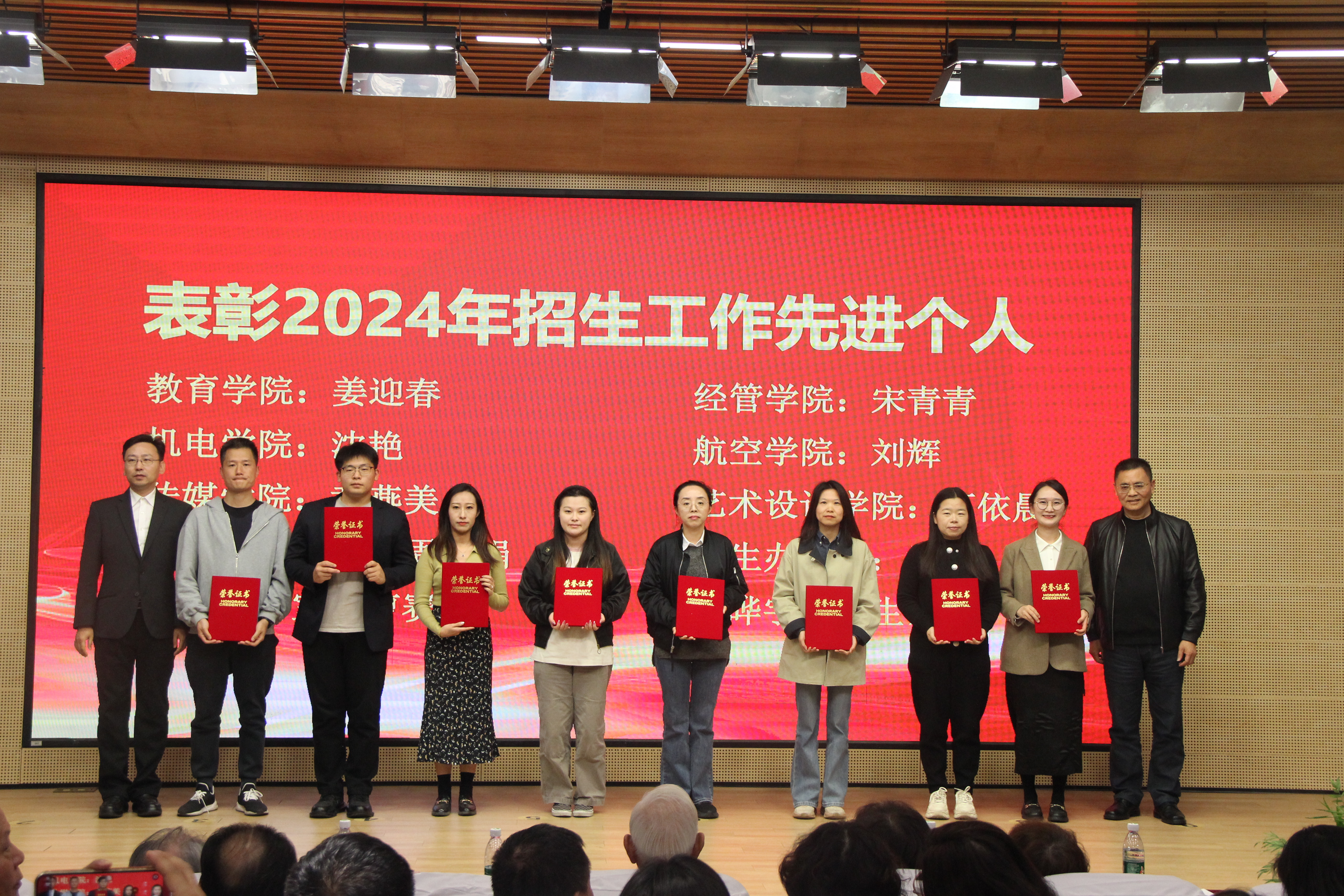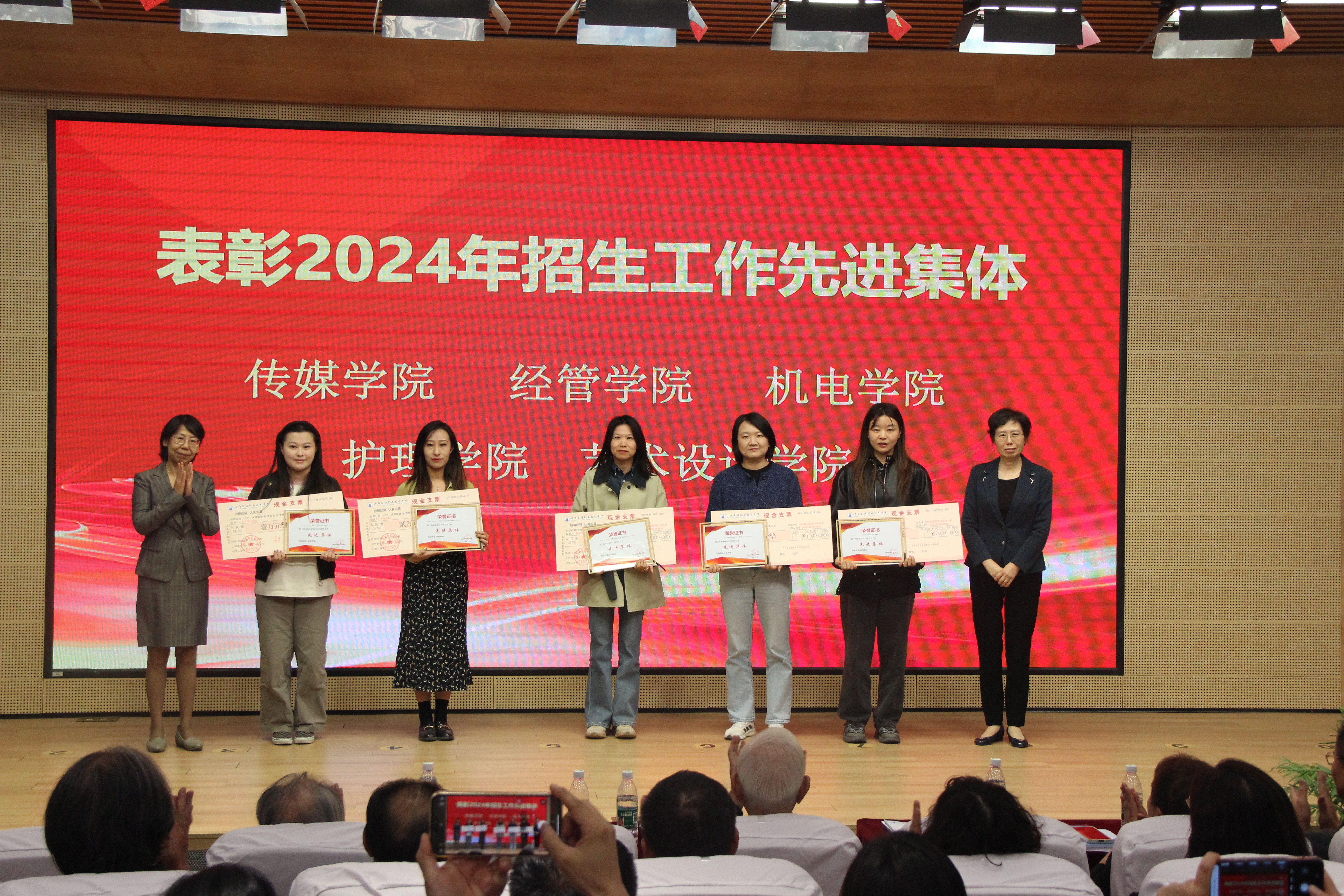 会议对在本年度招生工作中表现突出的先进集体和优秀个人进行表彰,党委书记曹蓉蓉宣读表彰决定。本年度共有5个二级学院获得“招生工作先进集体”荣誉称号,3个二级学院和3个职能部门获得“招生宣传工作先进集体”荣誉称号,共有10名师生获得招生工作“先进个人”或“优秀志愿者”荣誉称号。董事会和校领导为获奖单位及个人颁奖。
