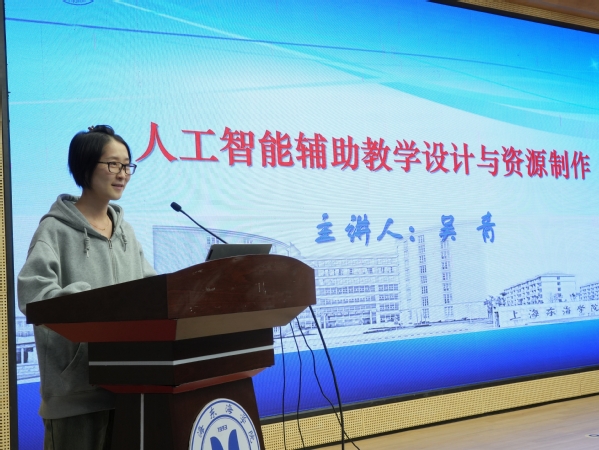 随后,信息工程学院吴青老师分享了题为“人工智能辅助下的教学设计与课程资源”的报告。她从如何应用AI大模型工具、明确教学设计思路及如何正确使用提示语句让AI快速精准帮助提升教学质量资源等四个方面做了分享,其中利用AI技术的教案制作、PPT课件和图片、视频的制作案例,使参加培训的教师们了解了AI赋能教育教学的实际意义,以及AI技术对于提升教师教学效率的操作性和实用性。