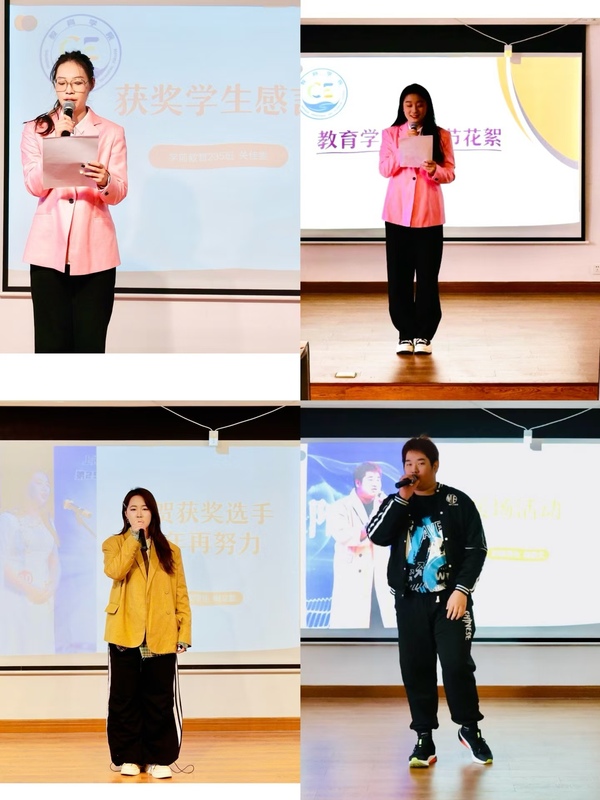 获奖学生感言环节,在模拟教学比赛中荣获“讲故事”“弹唱”“歌表演”三个一等奖的综合大奖一等奖获得者关佳雯同学分享了她的体会:“技能掌握需要持续学习和实践,技能提高需要不断地学习新知识,通过实践磨练自己”。她坦言,在参赛前也曾有过害怕、困惑、忧虑和担心,但正是这些困难激发了她前进的动力,每一次尝试,每一次失败,都是成长的宝贵财富。她的话语中充满了对学校的感激和对未来的憧憬。