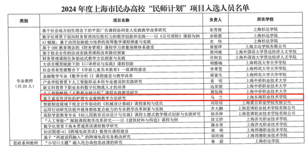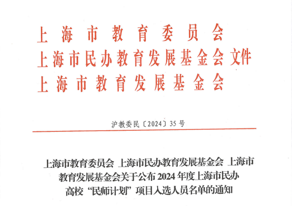 近日,由上海市教育委员会、上海市民办教育发展基金会和上海市教育发展基金会举办的2024年上海市民办高校教师专项培育计划项目(简称“民师计划”)公布评审结果,我校护理学院马兰成功入选“专业教师”组别,经管学院吕薇、信息工程学院刘艳成功入选“‘双师型’教师”组别、经管学院郑梅青成功入选“管理人员”组别。