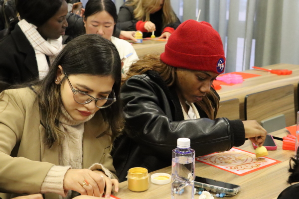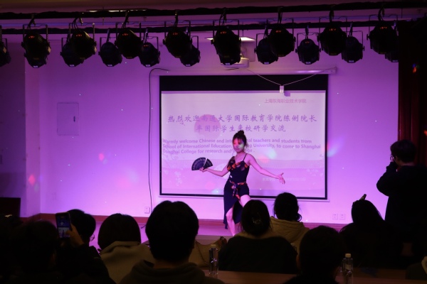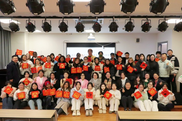 参观活动结束后,东海学院组织开展了中外学生交流联欢活动。联欢会上,教育学院学生倪俊义演唱中英文歌曲开启暖场,学生李文敏与老师侯延华合唱《芦花》将氛围推向更高,学生张鸣卿表演舞蹈《听雨》,展示了中华传统文化之韵美。国际学生Josephine Fioretta Andjani等人表演中文歌曲《有点甜》。联欢会结束后,大家一同完成福字拓印手工活动,体验中国“福”文化,同道中国福,合照留念。