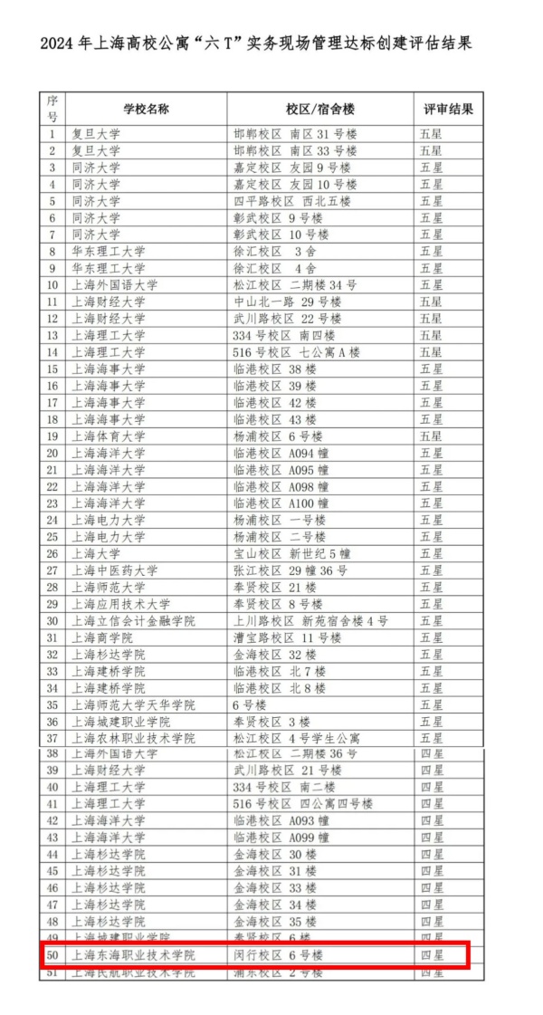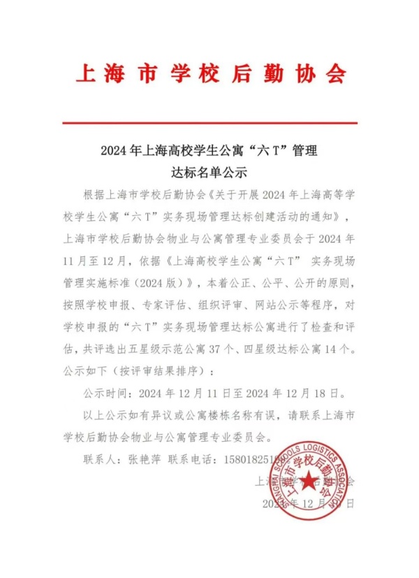 日前,在上海市后勤协会物业与公寓管理专业委员会举办的“六T”实务现场管理达标评比中,我校6号公寓楼荣获四星荣誉。这一荣誉不仅是对学校后勤工作努力的肯定,更是对未来工作的鞭策和鼓舞。