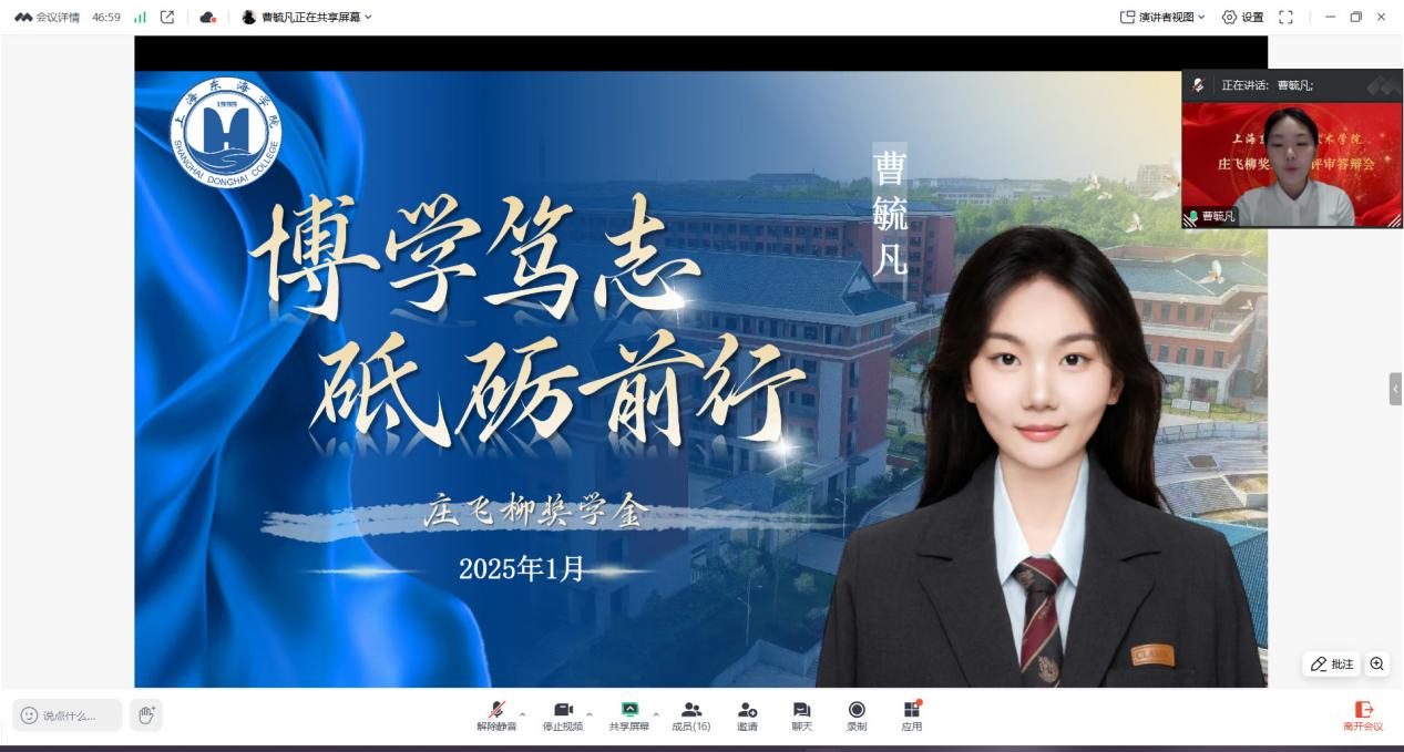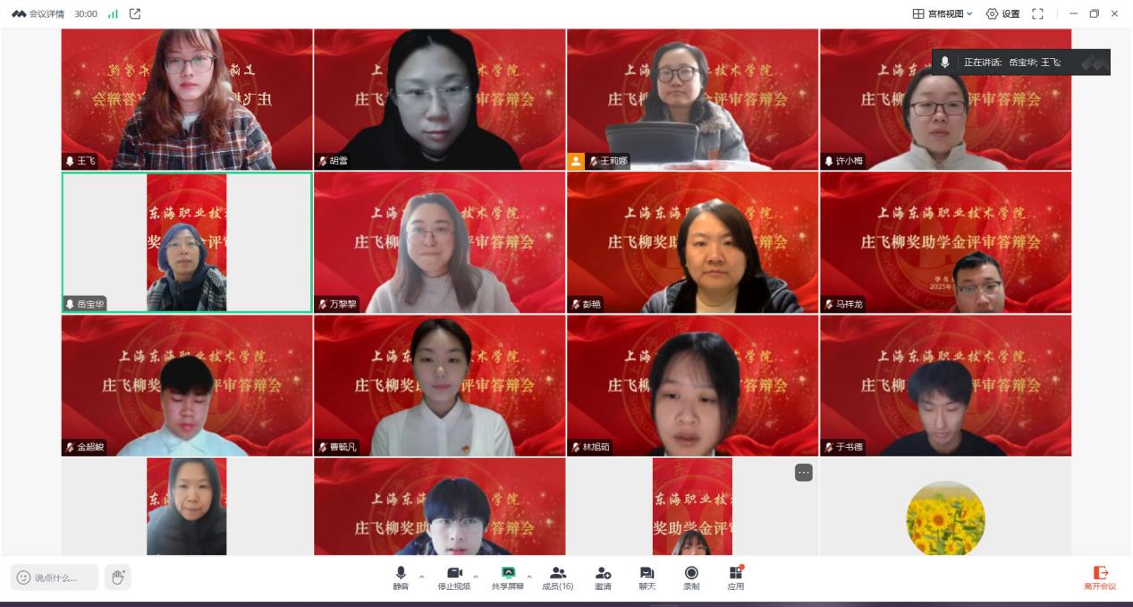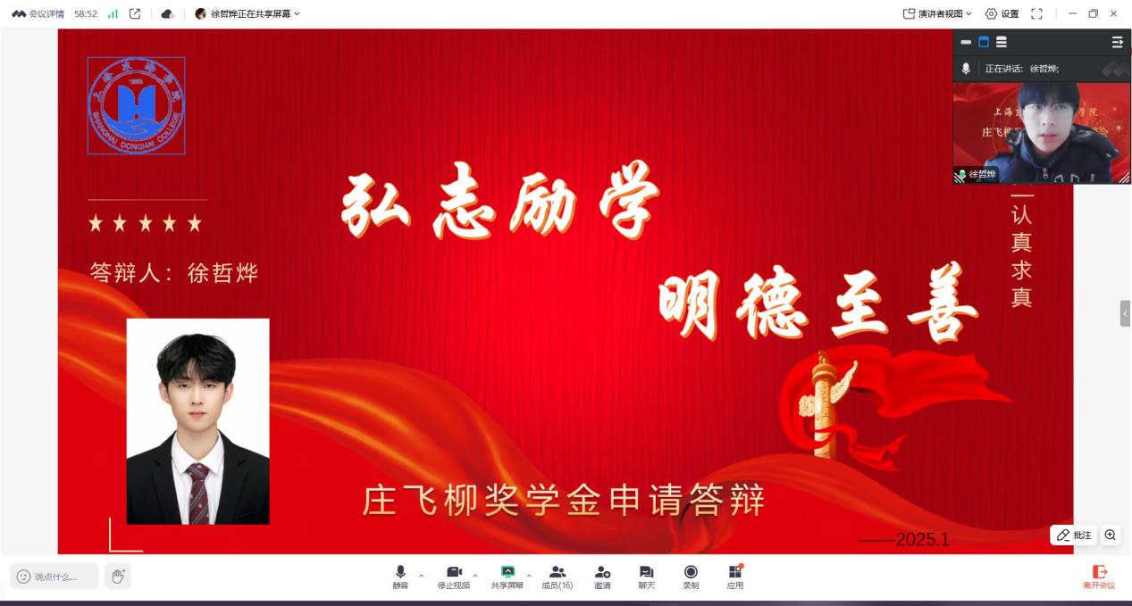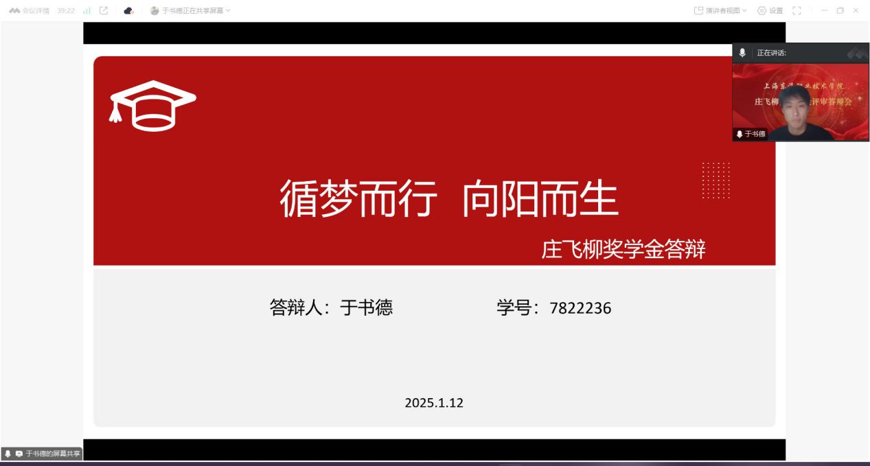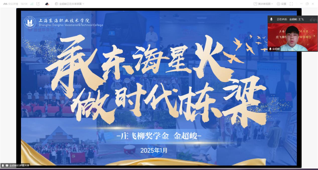 为调动我校学生刻苦钻研、奋发向上的积极性,促进学生综合素质全面发展,同时确保评审过程公开透明、公平公正。2025年1月12日,学生处通过网络平台在线召开上海东海职业技术学院2024年庄飞柳奖助学金评审答辩会。