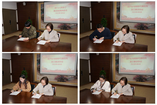 会上,上海沪港建设咨询有限公司、上海申诣建设咨询有限公司及国信招标集团股份有限公司三家招标代理机构代表分别介绍了公司业务规范与廉政建设举措,并现场与资产处签订《廉洁协议》。资产处全体工作人员同步签署《廉洁自律承诺书》,承诺严守纪律、规范履职。