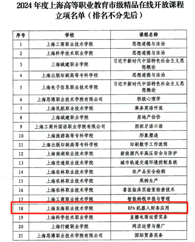 近日,上海市教育委员会公布了2024年度高等职业教育市级精品在线开放课程认定结果,由经管学院朱丹萍老师主持的《RPA机器人财务应用》课程成功入选。这是会计系在数智化教学改革领域的又一重要突破,标志着会计系在“AI+财务”领域课程建设迈入新高度。