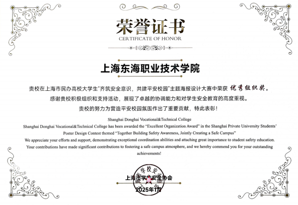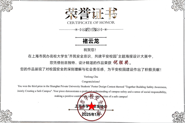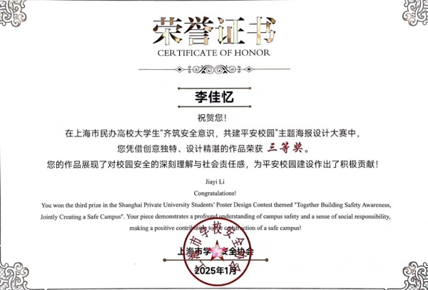 近日,上海市民办高校“共铸安全意识,共建平安校园”海报设计大赛结果揭晓。我校信息工程学院李佳忆同学创作的《拒绝校园霸凌》荣获三等奖,传媒学院褚云龙同学创作的《禁毒宣传融入校园,铸牢安全防线》荣获优胜奖。同时,我校荣获“优秀组织奖”,连续三年荣获此项荣誉。