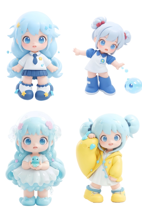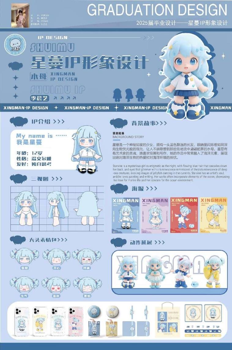 设计说明:在当今时代,随着人们对于自然生态和海洋生物的关注度日益增加,水母这一神秘的海洋生物以其独特的形态和优雅的生活方式吸引了众多目光。水母女孩IP形象的选题背景,正是基于这样的社会文化背景和市场需求而诞生的,我设计了一个以水母为主要灵感来源的IP形象,她的名字叫星蔓,星蔓的形象设计融合了海洋文化的神秘与美丽,以及人们对海洋生物的好奇和敬畏。她不仅是一个形象可爱的角色,更是一个情感的载体,代表着人类与海洋之间的深厚联系。希望通过水母女孩的故事我们可以探讨人与自然和谐共生的理念,传递保护海洋环境的重要性。