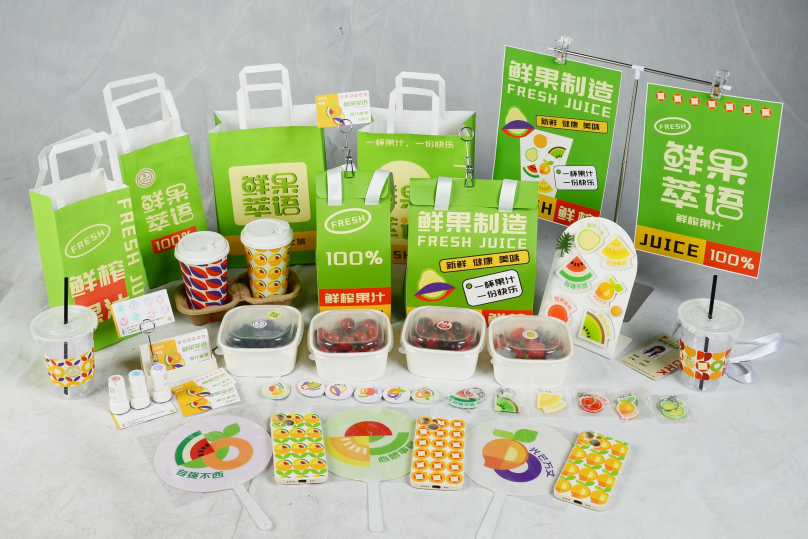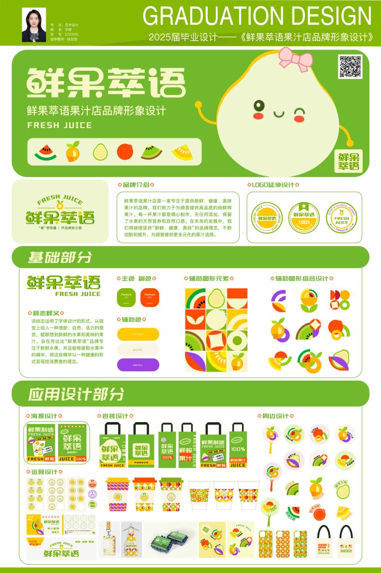 设计说明:随着健康生活方式的兴起,消费者对天然、健康的饮品需求日益增长,本设计旨在为“鲜果萃语”打造一个具有文化深度和传递健康的品牌形象。鲜果萃语果汁店致力于为顾客提供高品质的纯鲜榨果汁,每一杯果汁都是精心制作,无任何添加,保留了水果的天然营养和自然口感。以“果”然有趣/开启缤纷之旅为核心理念,结合现代都市生活与点线面重构的表现形式,提取水果的自然色彩与形态,融入品牌视觉设计。通过简洁而有趣的图形语言,传递品牌的新鲜感与活力,展现出鲜果萃语果汁店“新鲜、健康、美味”的品牌理念。