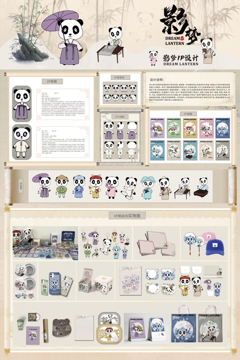 设计说明:设计该IP创意的来源来自于我的热爱,我想做一系列跟传统文化相关的IP形象,想通过IP活泼可爱的形象来使人们更进一步地了解和喜爱我国的传统文化,在创意初期,以什么形象来作为这个主题的主体创作使我犯了难,后来我就想到了我国的国宝——熊猫,以它为主题形象来进行传统文化的推广再合适不过了,所以我就围绕这个主题展开了创作。设计了影宝和竹梦两个原始IP,选取了丝绸、茶叶、瓷器、剪纸、刺绣、武术、书法、京剧等传统文化作为IP延展,除了这些我还引申出了各种IP服饰与动作。如:武术动作的熊猫、手捧瓷器的熊猫、剪窗花的熊猫等等一系列创作,并将这些创作制作成了各种文创产品,希望消费者可以在喜欢IP形象的同时了解并爱上中国传统文化。