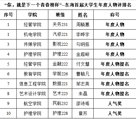 本次东海首届大学生年度人物先锋答辩会将产生东海年度人物,年度人物提名奖和年度人物人气奖若干,不仅为优秀学生提供了展示自我的平台,更为广大同学树立了可学可做的身边榜样,激励更多东海学子向榜样看齐,在青春的赛道上奋力奔跑。