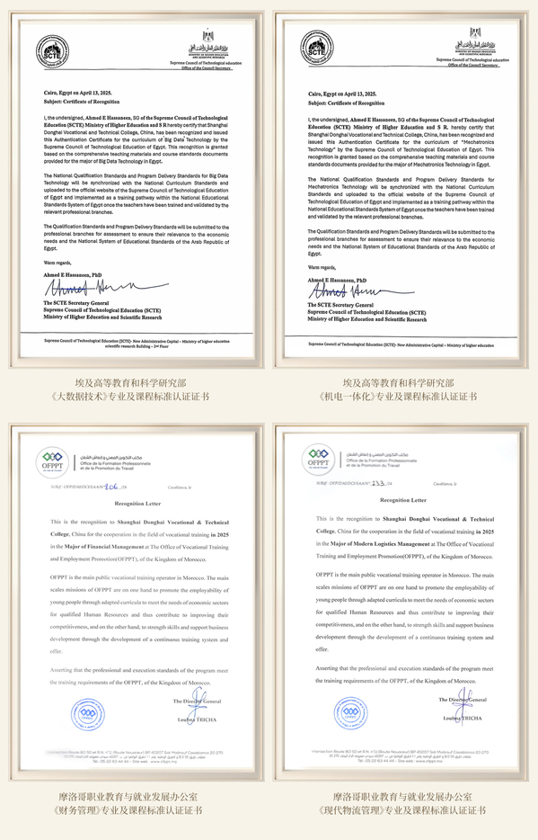 近日,上海东海职业技术学院在国际职业教育领域喜讯频传,专业与课程标准接连获得埃及、摩洛哥官方认证,国际化办学成果显著。